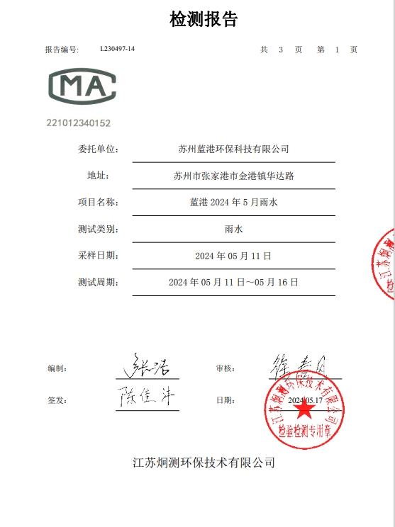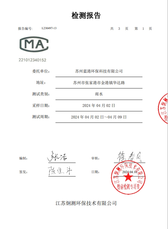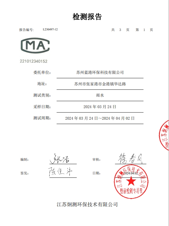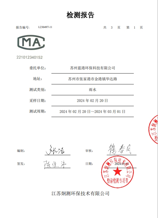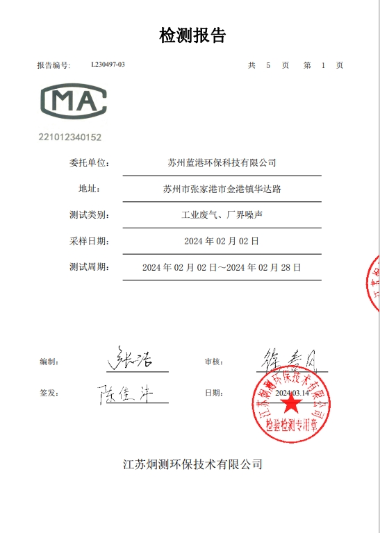 蘇州藍港環保科技有限公司檢測報告已公示,詳情請查...